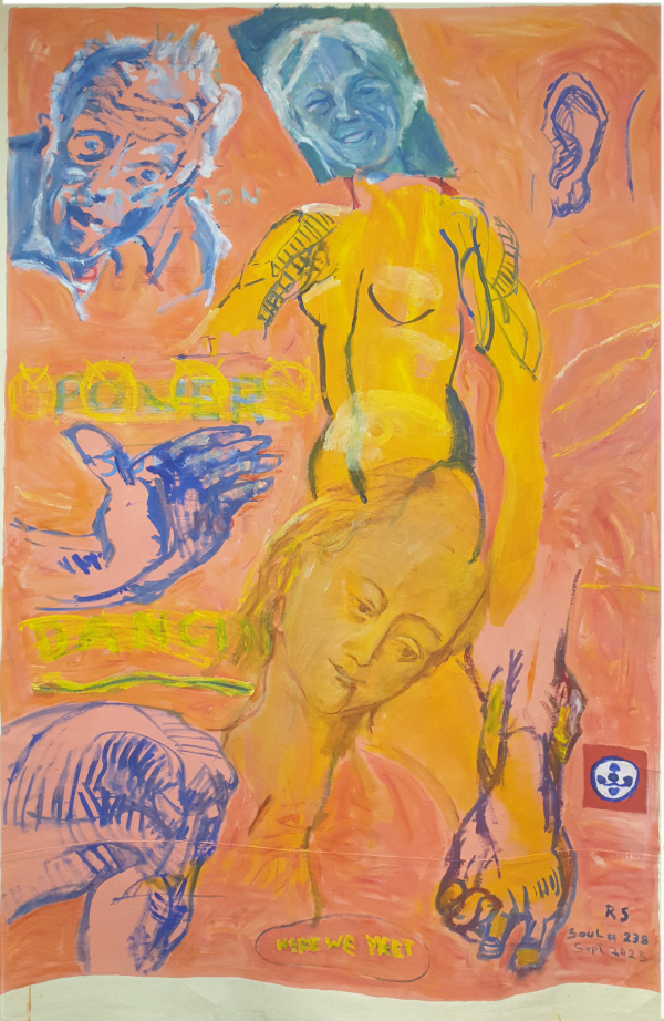Here we meet Olieverf op doek, 140 x 260 cm, Soul # 238, oktober 2025 In dit schilderij staan de beelden netjes naast en onder elkaar. Middenboven een nageschilderde foto van mijn moeder en links een zelfportret, middenonder een poging tot een torso, uit het hoofd geschilderd, en dan een nageschilderde renaissance-tekening, het origineel is prachtig. Een oor, een hand, een knie en een voet. Hoe je het ook wendt of keert, hier ontmoeten we elkaar, jij kijkt naar wat ik heb gemaakt, 'Here we meet'. Bij jou roepen deze beeldelementen zeker ook andere associaties op dan bij mij: het oor / van Gogh, de hand / het maken, een knie / voetballen / kracht en een voet / wassen, maar ook de afgehakte voet van een dief. Jouw associaties? Daarmee lopen onze gedachten weer uit elkaar. Even deelden we ons pad. De korte ontmoeting en wat het allemaal losmaakt in onze hoofden. Dankjewel voor het kijken. ‘Elk werk legt een vluchtig, nooit terugkerend moment vast en nodigt ons uit om stil te staan, te kijken en betekenis te vinden in wat dichtbij is.’ Een citaat van de schilderes Lois Dott bij haar expositie in het Kunstmuseum Den Haag. Met dank aan Hans Laban |